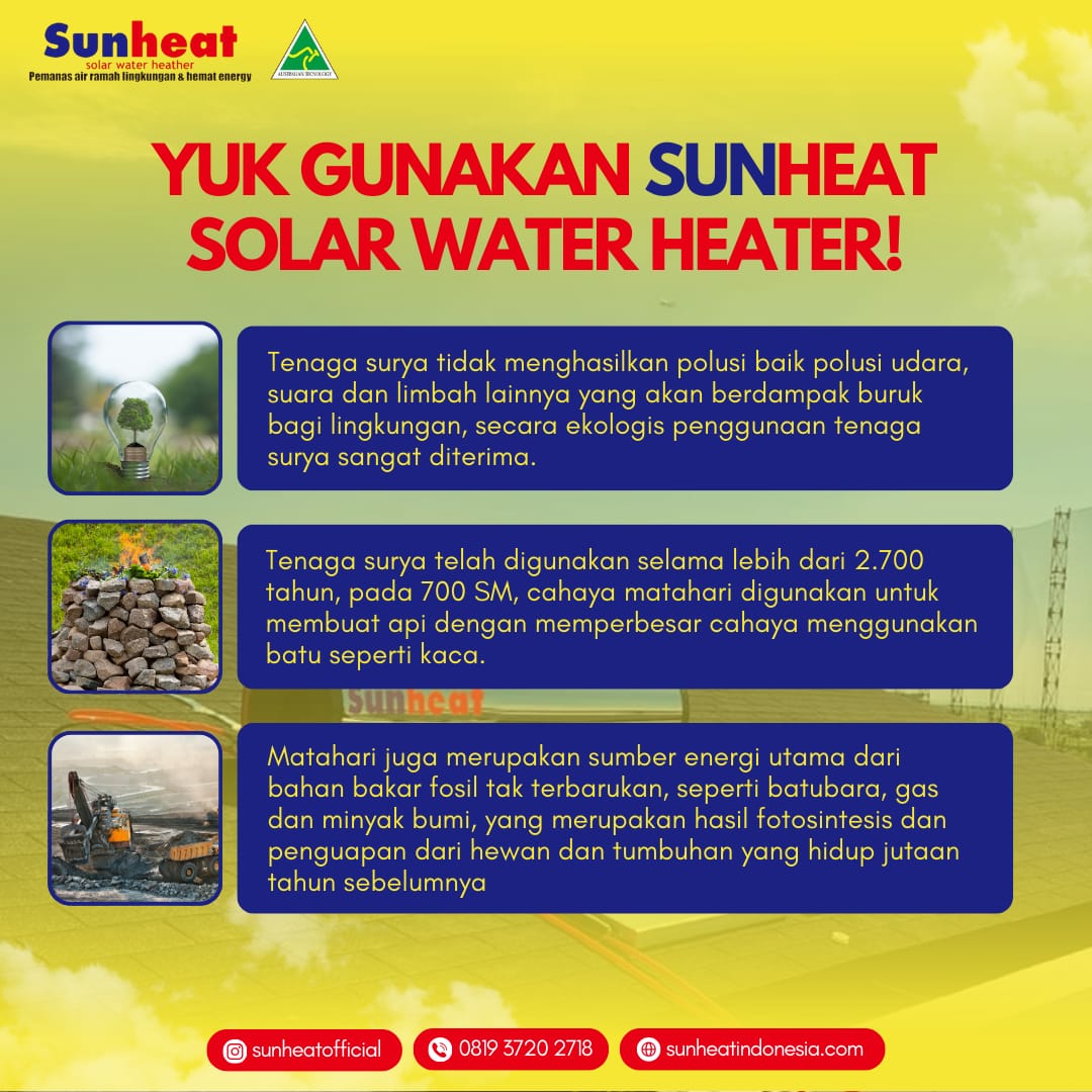 Anda sedang mencari pemanas air yang berkualitas untuk kebutuhan sehari-hari buat keluarga? Tenang saja! Pasang solar water heater no 1 di Indonesia dari Sunheat/ Produk pemanas air ini bisa menghasilkan suhu panas yang sangat baik, membuat kulit jadi lebih sehat, produk dengan harga yang terjangkau, tanpa perlu perawatan khusus.